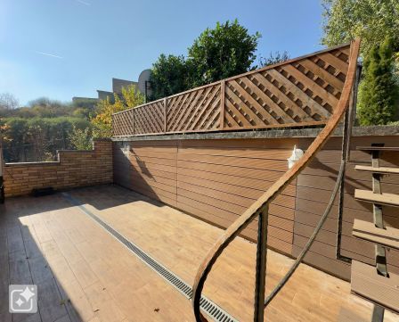 Tetőtér: eredetileg három hálószobásnak tervezett szint, jelenleg két hálószoba, egy nagy közösségi tér, kádas fürdőszoba és egy napfényes tetőterasz alkotja. A teraszról kis lépcső vezet a hátsó kertbe, ahol egy külön bejáratú kiskapu is található.