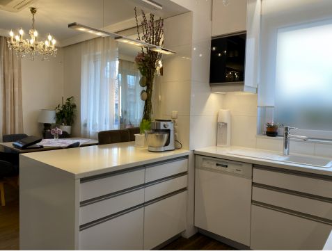 Az ikerház közös fala WC-vel határos, a gépesített konyhabútor a vételár részét képezi.