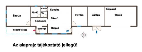 Elosztása: amerikai konyhás nappali, egy nagyobb, és egy kisebb szoba, fürdő, külön toalett, kamra, közlekedő, szélfogó.