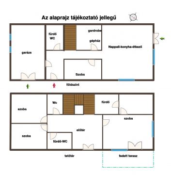 A földszinten amerikai konyhás nappali, hálószoba, fürdő + WC, tároló, fedett terasz, fedett autóbeálló (garázs),