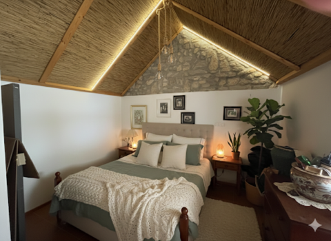 A kisebb házban, 38 nm-en, egy szoba + kis galéria, tároló és fürdő található.