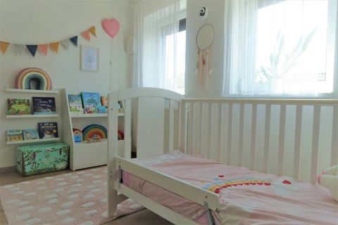 Az emeletet keményfával burkolt, elegáns világítással kiegészített, széles lépcsőn lehet megközelíteni. A felső szint teljes értékű belmagasággal rendelkezik, ahol 3 hálószoba, közlekedő folyosó és egy RAVAK termékekkel felszerelt kádas fürdőszoba található. Erről a szintről egy lenyitható aluminium létráról juthatunk a szigetelt és burkolt padlástérre, amely ideális, extra tárolási lehetőséget biztosít.