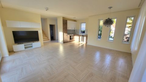 Különálló, új építésű családi ház, modern stílusban épült 2016-ban, 467 nm-es telken. A kert egyik végében egy 10 nm-es szigetelt faház szolgálja a kerti eszközök tárolására a helyet.