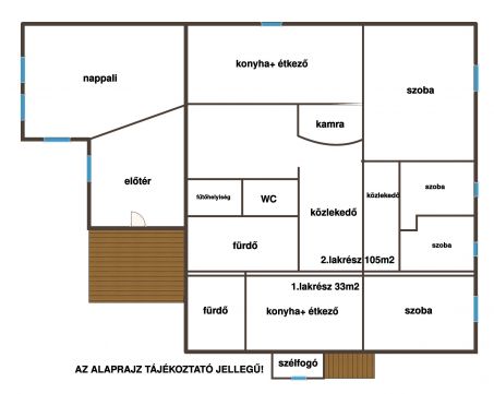 A nagyobb lakrész 105m2 hasznos alapterületű, 29nm-t utólag épültek hozzá, könnyűszerkezetből néhány évvel ezelőtt.