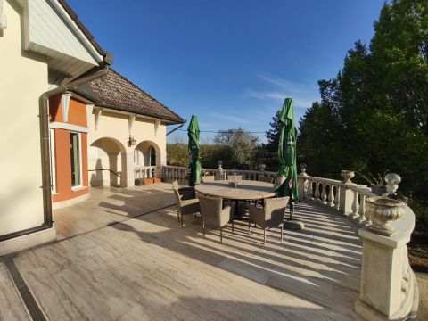 Ebben a nyugodt környezetben kínálunk megvételre egy különleges hangulatú, teljes privát szférát biztosító birtokot. Az ingatlan egy 3.938 m²-es telken helyezkedik el, gyönyörűen parkosított kerttel, automata öntözőrendszerrel, fúrt kúttal és saját teniszpályával.