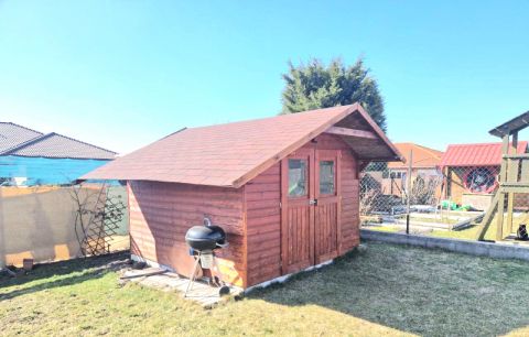 A kert rendezett, több funkciós: pihenésre, kertészkedésre és családi programokra is alkalmas. Automata öntözőrendszer, magaságyás és gyümölcsfák is megtalálhatók.