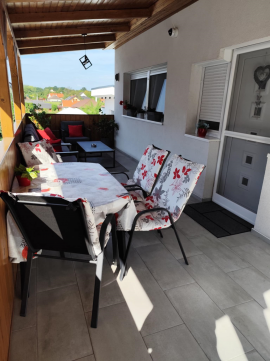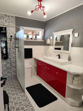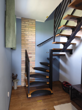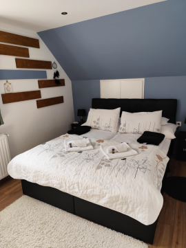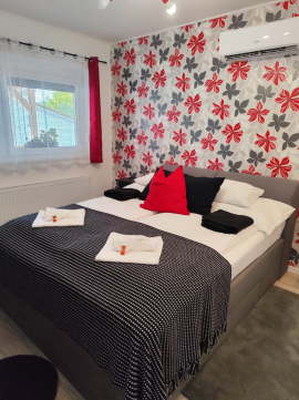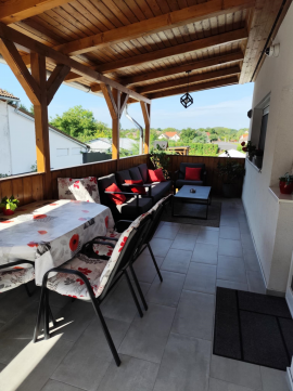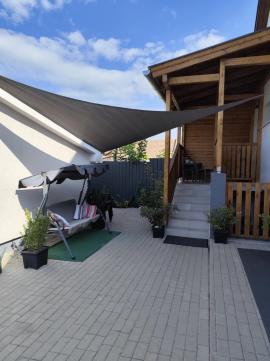 Gyönyörű örökzöldek ölélésében, 971 m2 gondozott kertben felépült 144 m2 lakótérrel rendelkező kétszintes ház. Fedett teraszról lépünk be a földszinti lakrészbe ahol 4 fő befogadására alkalmas amerikai konyhás nappali, hálószoba, fürdőszoba szolgálja a kényelmet. A fenti lakrész a ház hátsó részéből közelíthető meg egy kisebb fedett teraszról, zárt lépcsőházon át. 'Természetes' hangulat fogad a fa gerendás tetőtérben, ahol 4 fő kényelmére amerikai konyhás nappali, hálószoba, fürdőszoba és gardrób került kialakításra.