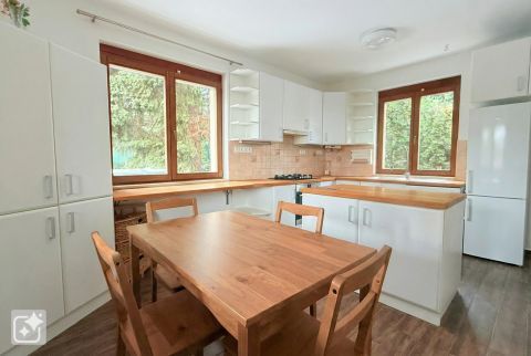 A kert praktikus méretű, gondos kezek tervezték meg minden szegletét. A hátsó kertben helyeztek el egy kültéri, fedett konyhát, kemencével, egy sós vizes, ellenáramoltatóval ellátott medencét. A ház előtt autóbeállót találunk, fedett tárolót, kis játszósarkot.