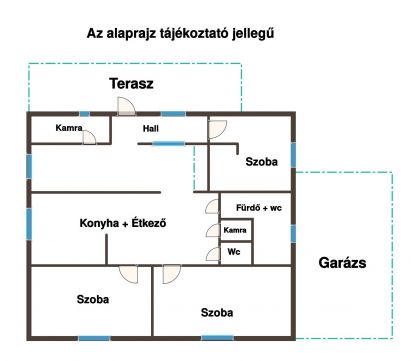 A ház elosztása praktikus és otthonos: három különnyíló szoba biztosít kényelmes privát tereket, míg a nagy méretű, étkezős konyha a családi élet központja lehet, felszerelt konyhabútorral és közvetlen kamrával. Az ingatlan egy fürdővel WC-vel, illetve egy különálló vendég-WC-vel is rendelkezik, ami nagyban megkönnyíti a mindennapokat.