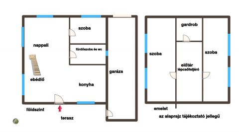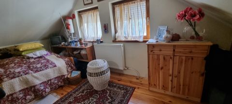 A praktikus elosztású, két szintes otthon 3 szobával, nappali + amerikai konyhával és fürdőszobával rendelkezik. A fa nyílászárók és fa beltéri ajtók természetes, meleg hangulatot adnak; a hőszigetelt műanyag bejárati ajtón és a műanyag redőnyös ablakokon keresztül pedig a modern kényelem biztosított. A konyha jó állapotú, beépített gépekkel felszerelt. A ház teljes területén riasztórendszer került kiépítésre.