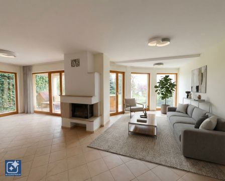 348 m² összterület, két teljes értékű lakás kandallós, teraszos nappali