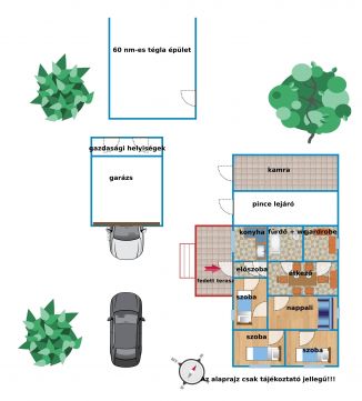 - egy 60 nm-es különálló helyiség (Régen istálló volt, elkezdték felújítani. A belseje gipszkartonozva van már. Vagyis kialakítható egy külön álló kisház. Így akár két generáció is kényelmesen elfér.)