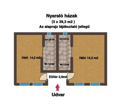 A 3859 nm-es, összközműves belterületi telken kapott helyet egy családi ház (107 nm), nyaralóházak (3 × 40 nm) és egy rendezvényhelyszín (68 nm + 135 nm fedett terasszal ellátva). Az épületek könnyűszerkezetesek és összkomfortosak.
