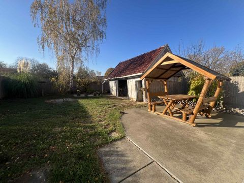 Kis könnyűszerkezetes alsó épület is lett építve. Az udvar hátsó részén egy fa 6 személyes kerti kiülő is elhelyezésre került, ami praktikus egy kerti főzés során!
