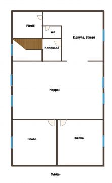 Földszint: korábban vendéglátó egység üzemelt, melyhez konyha és kiszolgáló helyiségek tartoznak.