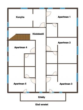 Első emelet: 5 különálló apartman és egy háztartási helyiség kapott helyet.