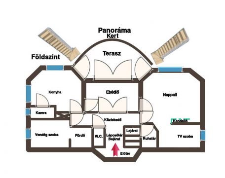 A földszinten az előszobából, külön is nyílik minden helyiség, a bal és a jobb oldali helyiségek és a külső formák tükörképei egymásnak. A ház központi részén a családi ebédlő, amelyből egyik irányba a konyha-kamra, a másik oldalon a családi nappali és TV szoba, amelyet hangulatos kandalló választ el egymástól. Mindhárom térből kiléphetünk a napos és panorámás teraszra, ahonnan csodálhatjuk az elénk táruló természetvédelmi területet, a kilátókat és akár a naplementét. Ezen a szinten található még egy dolgozó/vendégszoba és ehhez közvetlenül kapcsolódóan egy fürdőszoba W.C.-vel.