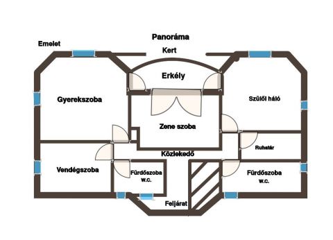 A felső szinten, a földszinti kialakításhoz hasonlóan a központi térben egy közösségi tér, zeneszoba, tőle balra a gyerekszoba és jobbra a szülői hálószoba. Mindhárom szobából kijárat a kb. 12 nm-es DNY-i tájolású, 180 fokos panorámával rendelkező erkélyre. A szülői hálóhoz kapcsolódik egy gardróbszoba és egy kádas fürdőszoba. A szinten található még egy további vendégszoba, saját tusolós fürdőszoba W.C.-vel.