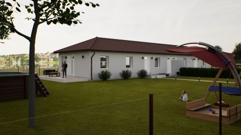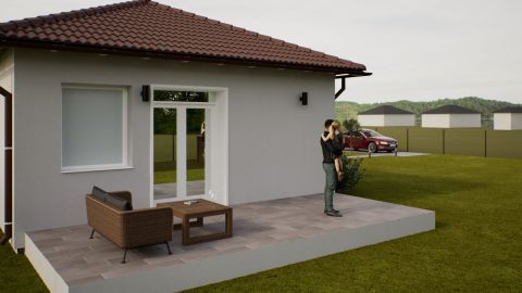 Kialakítása: 2 szoba, nappali, konyha+étkező, kamra, tároló, háztartási helyiség, fürdő+wc, külön wc, előtér, közlekedő, nyitott terasz 20 m2