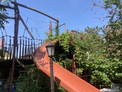 Az udvar jelentős részében egy komplett gyerekjátszótér, egy cc 3x7 m fűthető medence, egy kerti tó is helyet kapott. A kertben található egy 15 nm-es kerti pergola, bársarokkal.