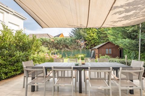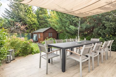 A gondozott kert kellemes pihenőhelyet biztosít a család számára, ideális grillezéshez, kikapcsolódáshoz vagy gyerekek számára játszótér kialakításához.