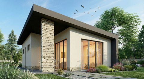 A könnyűszerkezetes nappali +hálós ház, a telek adottságaihoz tökéletesen illeszkedik.