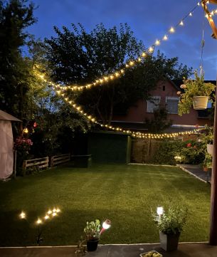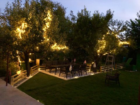 A kertben egy hangulatos pavilon található világítással, hangfallal, amely kellemes helyszínt biztosít a nyáresti beszélgetésekhez, grillezéshez, baráti társaság összejöveteléhez egybekötve egy filmnézéssel, amit a ház oldalán meg tudunk tekinteni.