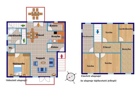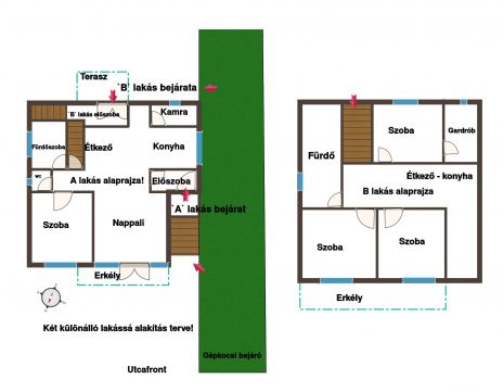 A két szintet egy ajtó beépítése után külön bejárattal, 2 teljesen külön álló lakrészekké lehet átalakítani.