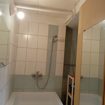 Ugyancsak az előszobából nyílik egy közel 3m2-es fürdőszoba, ahol zuhanyzó van kialakítva és ebben a helységben lett elhelyezve a WC is.