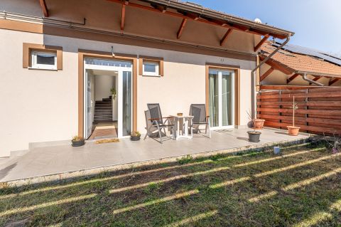 Két terasz is szolgálja a kényelmet: a földszinten egy 14 m²-es, az emeleten pedig egy 5 m²-es erkély biztosít kellemes szabadtéri pihenőhelyet. A ház extra felszereltségéhez 2 klíma is tartozik, ami a nyári komfortot jelentősen növeli.