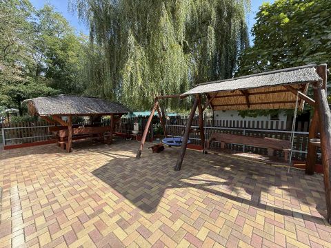 A ház környezetében viacolor burkolat, hangulatos kiülő, automata öntözőrendszer, valamint egy kis halastó is helyet kapott valódi békés oázis.
