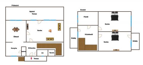 Az emeletes ház földszintjén helyet kapott 2 szoba, konyha, kamra, előtér, wc, és egy tároló.