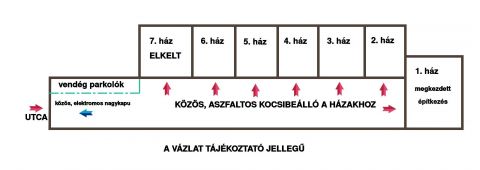 Egy 7 házból álló, lakópark jellegű környezetben épül, közös elektromos kapuval, vendégparkolókkal és aszfaltozott belső úttal. A területen közvilágítás kerül kiépítésre, + minden háznál előkészített kábelezéssel az udvari világításhoz. A 7 házból egy már elkelt, hat még elérhető.