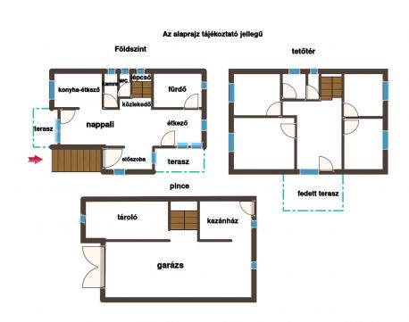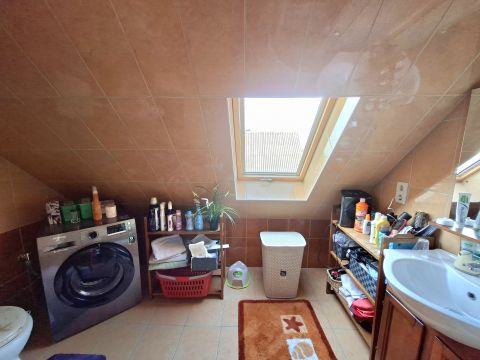 A földszinten hatalmas, napfényben úszó nappali, étkező és modern, tágas konyha, kamra, fürdőszoba, wc, előszoba és 2 terasz, a tetőtérben 4 szoba, tágas, napfényes nappali, fürdő, wc és fedett terasz található.