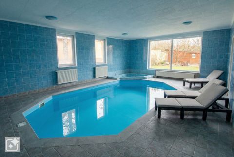 befejezés előtt álló, 18 m²-es vízfelületű medence (látványterv a képek között) és beépített jakuzzival rendelkező 40 m²-es wellnessrész