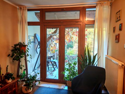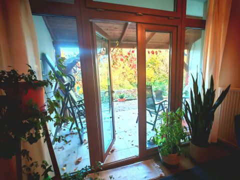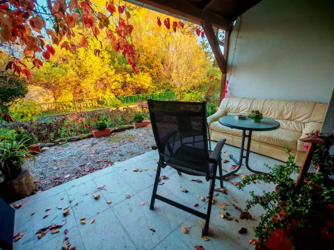 A nappali üveges ajtaja egy hangulatos teraszra nyílik, ahol a természet nyugalmát élvezhetjük.