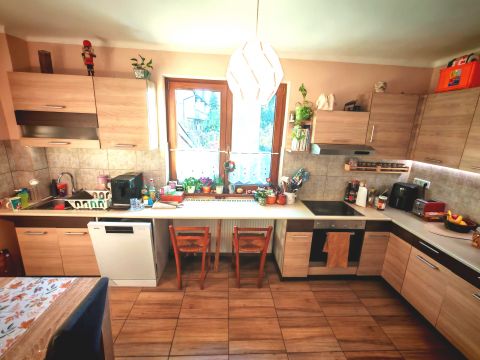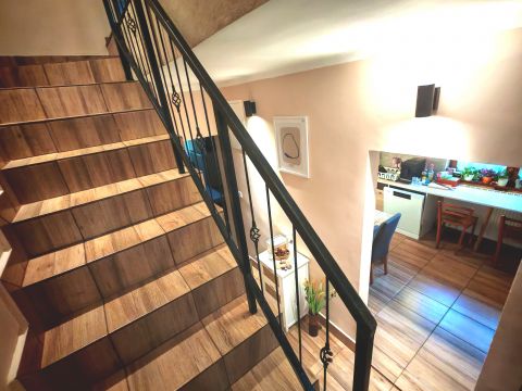 A földszinten étkezővel egybenyitott konyha, vendégmosdó, és egy tágas nappali  található.