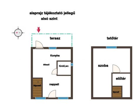 Az alsó szinten egy nappali, valamint egy konyha, étkezővel, fürdő wc-vel rendelkezik, a nappaliból pedig kényelmes lépcső vezet az emeletre. A felső szinten egy tágas, 20 m²-es szoba kapott helyet amely akár két szobára alakítható.