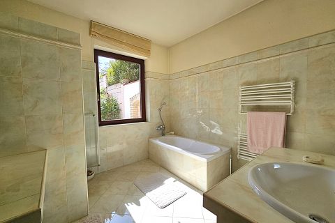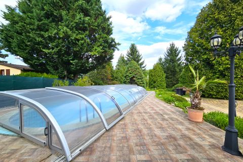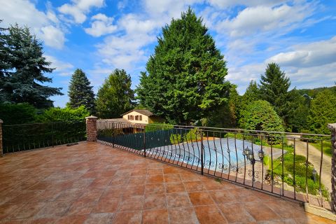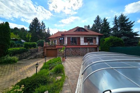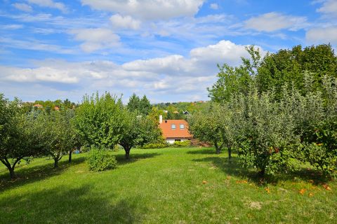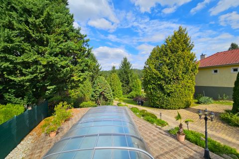 A parkosított, gondosan karbantartott, domboldali telek termő gyümölcsfákkal beültetett. A kert egyik meghatározó eleme a nagyméretű, fedett úszómedence, amely burkolt környezetével harmonikusan illeszkedik a kert egészéhez, és az év nagy részében használható. Több parkolóhely áll rendelkezésre, a fekvésből adódóan a környékre panoráma nyílik.