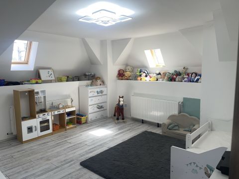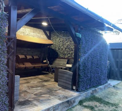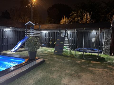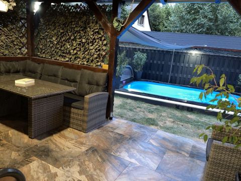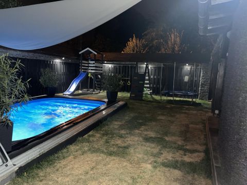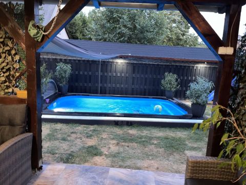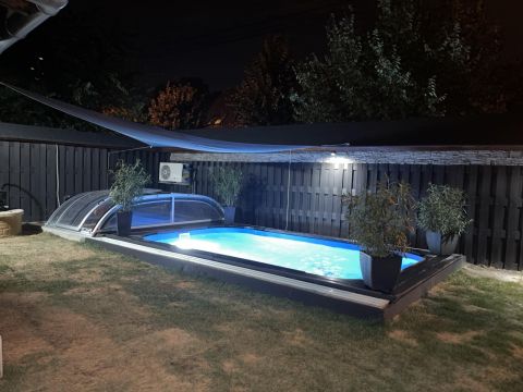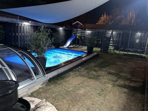 2 szint 7 szoba 2 fürdőszoba, 200 m² lakótér + 200 m² telek, 5,5 × 3,5 m-es, 1,5 m mély medence polikarbonát fedéssel