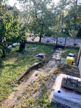 A kertben gyümölcsfák és egy kisebb veteményes található.