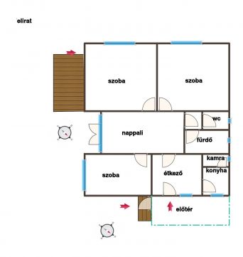 Földszinten: 3 szoba, nappali, előtér, télikert, konyha, fürdő, WC, közlekedő.