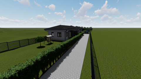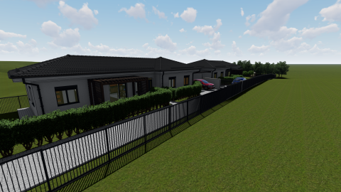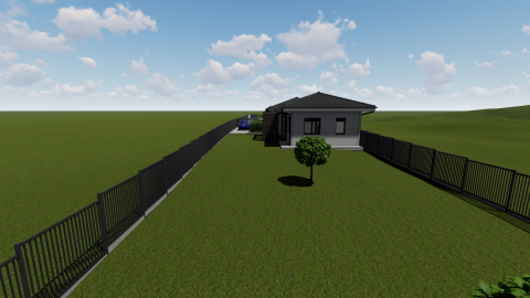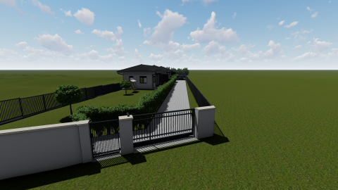 Kerítés: Utcafronton zsalublokkból épített, homlokzati színnel megegyező színre színezett 160 cm magasságban, kiskapuval, kétszárnyú kapuval (max 3,5 m) az autófeljárónál. (Zsalublokk pillérek, homlokzat színével azonos nemesvakolattal) A két tolókapu kézi működtetésű, az automatikának védőcső kiállással. A további oldalakon körbe Kótaji táblás kerítés elemekkel. (A látványterven szereplő telekhatáron lévő kerítések, a funkció megjelenítését szolgálják!)