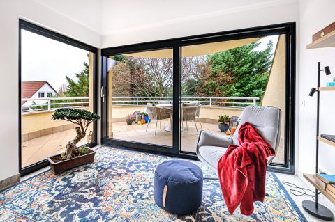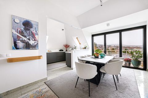 A lakás központi eleme a tágas nappali-étkezőkonyha hármas egysége, ahol a nagy üvegfelületek és a nappaliból és étkezőből nyíló teraszok valódi budai életérzést teremtenek.