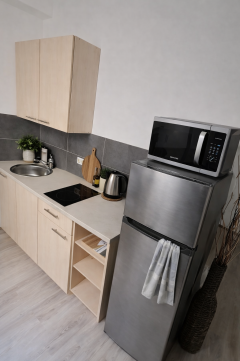 Az első lakrész tágasabb elrendezésű. Külön konyhával rendelkezik, innen nyílik a világos szoba, amely nappali és háló funkcióra egyaránt alkalmas. A fürdőszoba külön helyiségben kapott helyet. A tér arányos, jól bútorozható, kényelmes életteret biztosít.