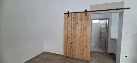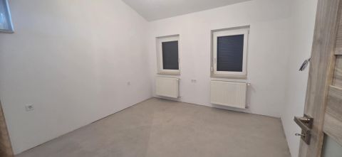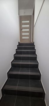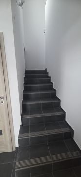 Elosztását tekintve: előszoba, tároló, lépcső, wc, fürdő, amerikai konyhás nappali, közlekedő, 2 szoba
