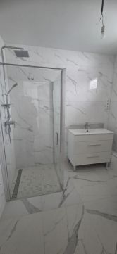 Elosztását tekintve: előszoba, közlekedő, 2 fürdő, lépcső, amerikai konyhás nappali. 3 szoba,