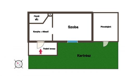 A lakás egy 4 lakásos társasház első tagja, az elosztása egy szobából, étkezős konyhából valamint fürdő+WC-ből valamint egy 4 nm-es fedett teraszból áll. A fűtésről gázkonvektor, a melegvíz ellátásról villanybojer gondoskodik. Az épület alatt egy 8 nm-es pince található a hozzá tartozó pincelejáróval, amely további 3.5 nm fedett, tárolásra alkalmas területet biztosít.