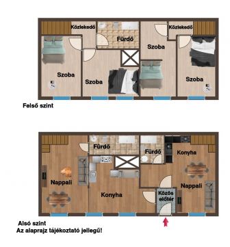 Az alsó szinten amerikai konyhás nappali került kialakításra, valamint egy WC-s fürdőszoba. A felső részen két külön hálószoba kapott helyet, ami ritka és rendkívül jól kihasználható megoldás ebben a méretkategóriában.