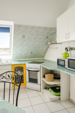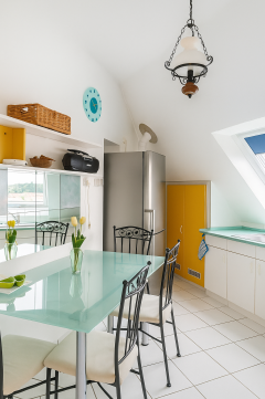 Tágas, világos konyha-étkező.